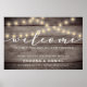 Rustic and elegant with calligraphy "welcome" features faux dark brown wood with string lights along the top wedding sign.