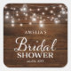Rustic Bridal Shower square sticker featuring lights in mason jars and strings of lights with the word "Bridal Shower" against a brown wood pattern background. It's the perfect sticker for a rustic or country bridal shower. Check out matching invitation and items like stickers and stamps here https://www.zazzle.com/collections/rustic_wood_mason_jars_and_lights-119202204970019494?rf=238364477188679314