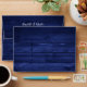 Personalized navy blue rustic wood wedding envelopes with a return address on a rustic wood background.