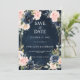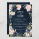 Dark navy blue floral geometric wedding save the date card featuring elegant bouquet of navy blue, royal blue , white , blush rose and sage green eucalyptus leaves and elegant glitter geometric neutral frame. Please contact me for any help in customization or if you need any other product with this design.