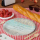 These rustic coastal themed wedding paper plates feature weathered wood with a scene of ocean waves crashing against the beach in the background, accented with string lights at the top.