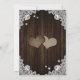 Rustic purple and blue floral wedding invitation featuring two floral hearts on a barn wood background adorned with white floral lace.