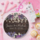 Wedding reception paper plates in a rustic wood design with purple and pink watercolor floral and glittering string lights. Add the couple's names and wedding date.