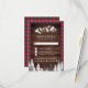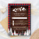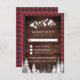 Elegant forest theme RSVP card featuring snow covered pine trees and rocky mountains with eye-catching typography. Flip the card over to reveal a red buffalo plaid pattern on the back of the card.