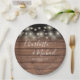 An elegant wedding plate featuring pretty string lights can be personalized with signature style names and your special wedding date on a rustic wood panels background. Designed by Thisisnotme©