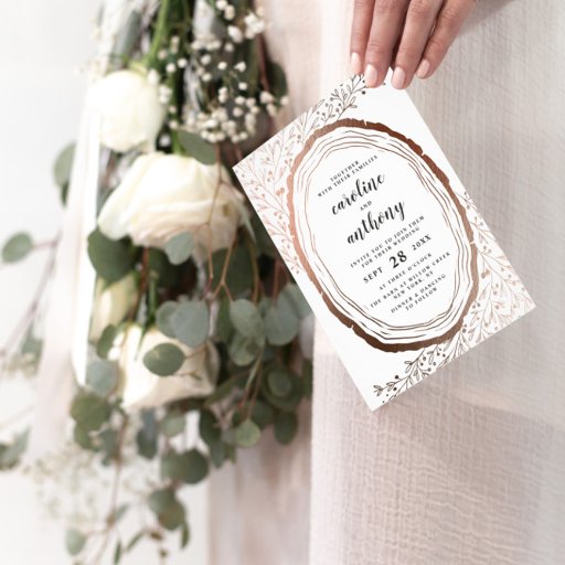 Rustic Wood Slice Copper Foil Autumn Fall Wedding Design with hand Drawn wood slice, twigs, leaves, branches, and berries. A Chic and trendy country Look for an autumn or any season wedding, nature inspired, perfect for a barn wedding venue, or mountain retreat. With copper bronze faux foil effect, and a modern trendy brush Script lettering Font - Personalized Wedding Dinner Reception Table Decor Menus!