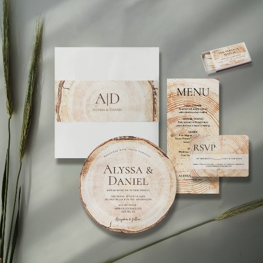 Complete your rustic wedding stationery suite with this elegant wood slice tree ring wedding RSVP response card. Inspired by natural wood grain and organic textures, this design features a beautiful tree ring pattern that adds warmth and rustic charm to your wedding invitations.