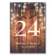Rustic table card with a wood background featuring string lights. The font colors and font styles on the table card design are all fully customizable.