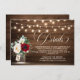 Rustic country string lights and mason jar with burgundy, red, Marsala, maroon , ivory, blush color floral bouquet and eucalyptus leaves on wood background wedding details card. Please contact me for any help in customization or if you need any other product with this design.