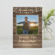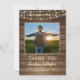 Your graduate's photo is accented with a rustic, country, brown weathered wood plank background and yellow glow string lights along with the title of THANK YOU, their school and CLASS OF year in a country western hand-printed font and their name in a rough brush script font. The back offers a place to type your thank-you message.
