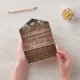 All in one wedding invitation with pretty string lights, signature style names and chic typography on a rustic wood background. The invitation includes a perforated RSVP card featuring a QR code. Designed by Thisisnotme©