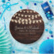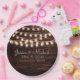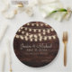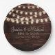 Rustic wood and string lights personalized wedding reception paper plate. Add the couple's names and wedding date.