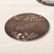 Elegant, country, rustic wood wedding paper coaster with names of bride and groom, date, gilded gold floral lace and string lights.