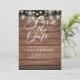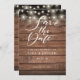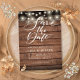 This rustic save the date card features string lights and an elegant script save the date above your details set in elegant typography on a rustic wood panels background. Designed by Thisisnotme©