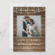 Your wedding photo is accented with a rustic, country, brown weathered wood plank background and soft yellow glow string lights along with the title of LOVE & THANKS and your wedding date in a country western hand-printed font and your name in a rough brush script font. The back features the same wood plank background and offers a place to type a general thank-you message (or delete the sample text to leave blank for personal handwritten notes of thanks). PHOTO TIP: For fastest/best results, choose a photo with the subject in the middle and/or pre-crop it to a square shape BEFORE uploading. Contact the designer via Zazzle Chat or makeitaboutyoustore@gmail.com if you'd like this design modified or want coordinating items.