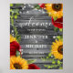 Create your own rustic welcome wedding signs using an easy to personalize poster template. The vintage barn wood design features a lovely yellow sunflower and rose watercolor border with greenery leaves and petite white baby's breath flowers hand illustrated by Raphaela Wilson. The typography style includes a whimsical elegant font combined with other modern typefaces that are completely editable by you. Should you wish to customize the design further, you can reveal other sunflowers and roses design elements, such as a floral swag, along with mason jars and string lights. These welcome wedding posters are perfect for your big day, or even a fall / autumn, spring summer bridal shower celebration. Prefer to change the gray wood to a different color? There are options for navy, teal, rich brown and winter white colors as well! Category: elegant wedding signs; diy rustic wedding signs; and sunflower wedding signs. Rustic weddings theme palette: red burgundy, gray/grey, yellow gold, white and black.
