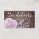 Rustic inspired enclosure card to contain your wedding details. Elegant white calligraphy on a faux wood background, with original watercolor lavender, rose and eucalyptus decoration. Easy to edit.