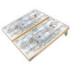 Rustic distressed white washed shiplap barn wood wedding cornhole set featuring a floral monogram. Distressed colors of white gray and pastel gray blue and pale pink floral.