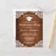 Graduation invitation postcard. Rustic style with brown wood planks background and white lace decor.
