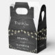 Thank your wedding guests with rustic elegance using these black and white favor boxes featuring a charming wooden textured backdrop enhanced with glowing hanging lights. Beautifully designed with white fonts to display the couple's names, wedding date, and location. A sophisticated "Thank you" is elegantly presented in a unique typography. These boxes are a perfect way to share treats and express your gratitude with a touch of rustic style and warm ambiance.