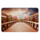 Magnet with a scenic photograph. A wooden bridge leading toward a pathway surrounded by forest trees changing color.