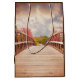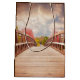 A birthday gift bag with a scenic photograph. A wooden bridge leading toward a pathway surrounded by forest trees changing color.