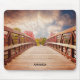 A mouse pad with a scenic photograph. A wooden bridge leading toward a pathway surrounded by forest trees changing color.
