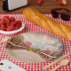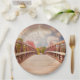 Paper plates with a scenic photograph. A wooden bridge leading toward a pathway surrounded by forest trees changing color.