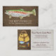 Rustic dark weathered stained barn Wood Fishing Guide Lake Charter Boat Business Card design. DRustic wooden board background handsomely sets off the elegantly hand painted watercolor rainbow trout, fishing creel and lures. For rustic outdoors wilderness, mountain lake or stream fishing businesses such as guide services, tackle shops, bait shops and boat rental services. This artwork was created by internationally licensed artist and product designer, Audrey Jeanne Roberts, copyright.