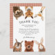 Rustic woodland theme baby shower thank you template card featuring illustration of a raccoon, fox, deer, owl, bear, and a rabbit. Gender neutral design.