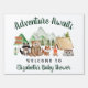 Cute rustic baby shower welcome yard sign featuring a watercolor illustration of woodland animals by their tent and campfire camping in the mountains and forest and "Adventure Awaits" and the mother-to-be's name in a dark hunter green script.
