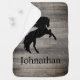 Rustic worn barn wood planks baby blanket featuring a black rearing horse silhouette and baby's name in white. This baby blanket fits well with a gender neutral or baby boy's ranch themed nursery!