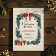This charming Christmas party invitation features a hand-painted wreath border with evergreen branches, holly leaves, red berries, golden bells, and blue ornaments. A burgundy ribbon bow tops the design, while a vintage lantern and wrapped gifts add festive warmth. Perfect for holiday gatherings with a rustic, traditional aesthetic. Fully customizable for your event details.
