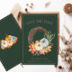Rustic Wreath Emerald Green Autumn Wedding Save the Date Card. Set the tone for your fall wedding with this rustic Save the Date card featuring a twig wreath, watercolor pumpkins, and warm autumn botanicals on a deep emerald green background. Perfect for barn weddings and harvest-themed celebrations with a touch of woodland charm.