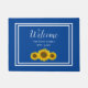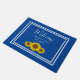 Enjoy this elegant monogram welcome doormat on a blue background. A simple white border and white customizable lettering allow you to add your own information. Yellow sunflowers add a rustic style to this item making it perfect for welcoming guests to your home or vacation house.