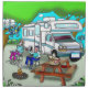 A couple sit in front of their RV drinking wine while looking at birds sitting in front of a a small RV in a tree also drink wine.
