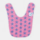 Do you know a small but mighty Superstar? This pink baby bib with light blue five-pointed star has customizable text which says "S Is For Superstar" on a pink background. The reverse side of the bib has a repeating star pattern covering the whole area.