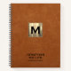 Modern notebook features a minimal luxury design with brushed metallic gold monogram on a simple sable brown leather print. Custom name and title, role or subject in classic block typography, centered in lower-thirds.