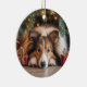 This Christmas ornament features a holiday portrait of a Shetland Sheepdog resting calmly beneath the Christmas tree, framed by evergreen branches, softly glowing lights, and wrapped presents. With its thoughtful eyes and peaceful posture, the scene captures the Sheltie’s gentle presence and quiet attentiveness during the most comforting moments of the season.