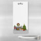 Destei's original cartoon illustration of a cute sable Shetland Sheepdog / Sheltie breed dog. The top a personalizable text area for a title. The dog is placed in a festive living room that has a fireplace. The fireplace is on and it has two red stockings hanging on the side of it. On the top of the fireplace there is a green wreath that is decorated with a red bow and some yellow circles as lights. On top of the mantle there are three small triangle shaped trees also decorated with yellow circles as lights. The mantle also has two beige candles on it. Next to the fireplace there is a festive green Christmas tree with two presents under it. The Christmas tree is decorated with red and yellow round ornaments and a gray garland. On the top of the tree there is a yellow star.