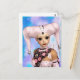 A whimsical postcard with a cute fantasy image featuring a pretty little pink Harlequin doll in a fantasy setting, with a tear rolling from one eye.