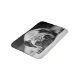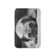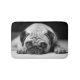Black and white photograph of a very adorable little pug with velvety ears and soulful brown eyes.
