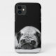 Black and white photograph of a very adorable little pug with soulful brown eyes.