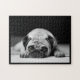 Black and white photograph of a very adorable little pug with soulful brown eyes.