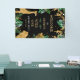 This jungle safari themed first birthday party welcome banner features gold faux foil animals (giraffe, lion and monkeys), gold and green jungle foliage, and a sprinkling of gold confetti on a black background. The words "Welcome to [child's name's] Wild One Birthday Party" appear in gold and white lettering. Customize by adding the name of the birthday boy or girl in gold text and the party date in white.