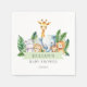 This safari adventure baby shower design showcases charming jungle animals including a hippo, giraffe, elephant, lion, monkey & tiger. Perfect for celebrating the arrival of a new bundle of joy. The vibrant colors and cute animal illustrations create a whimsical and playful atmosphere, setting the tone for a fun and memorable event. A delightful choice for any jungle-themed baby shower.