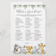 Safari animals themed baby shower what's in your purse game card features a watercolor safari animals illustration and watercolor greenery eucalyptus garland and elegant handwritten style font.