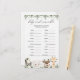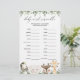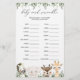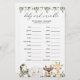 Lovely safari animals themed baby shower word scramble game card features a watercolor safari animals illustration and watercolor greenery eucalyptus garland and elegant handwritten style font.