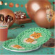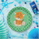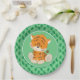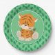 This party plate features a green background with a repeating pattern of jungle leaves. A cute baby clipart brown and orange tiger sits in the center of the plate.