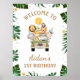 Cute predominately green and yellow safari themed boys birthday party welcome sign featuring a jeep full of jungle animals, some foliage, a yellow balloon, frangipani flowers.